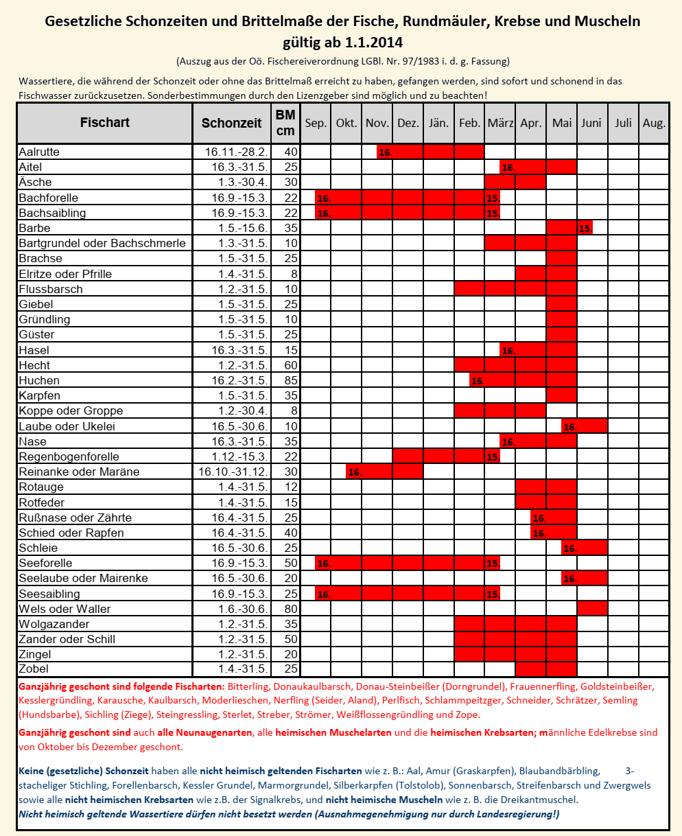 Schonzeiten und Brittelmaße Downloads: Schonzeitentabelle Schonzeiten-App Quelle: OÖ. Landesfischereiverband