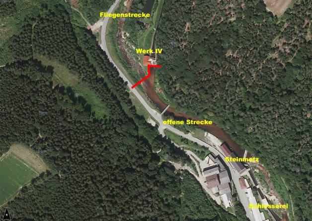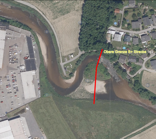 Offene Strecke: Alle gesetzl. erlaubten Fischereiarten, ganzjährig. Merckens Werk IV – bis untere Fischwassergrenze (Tafel ca. 50 m oberhalb Seberner-Brücke).